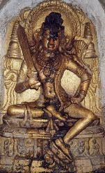 Manjushri in the form of Arapachana is one of the most common and recognizable images in Tantric Buddhism. Other than appearing with the hands in the Dharma teaching gesture this is the form that is most often depicted in paintings, murals and sculpture. The explanation of form is a brief introduction to how Manjushri appears in this particular appearance, what he holds in his hands, along with any other significant characteristics.