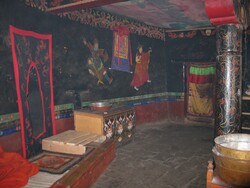 Kau Drag Dzong is the most famous retreat center of Sakya. It is located just south of the Lhakang Chenmo temple and up a steep river gorge half way to Kau Village - famous for its hot water and healing springs. Kau Drag Dzong was the hermitage of Lama Nam Ka'upa the student of Nyen Lotsawa. These teachers are well known for the practices of Chaturmukha Mahakala and the creation of the public form of Chaturmukha as Brahmanarupa Mahakala.